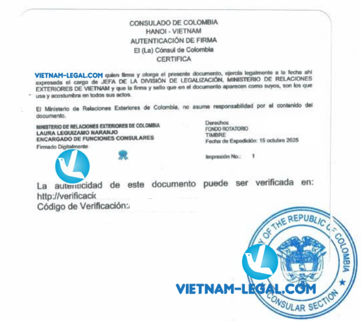 Kết quả chứng nhận lãnh sự và hợp pháp hóa lãnh sự các giấy tờ, tài liệu của Việt Nam (Chứng nhận ISO) sử dụng tại Colombia với con dấu và chứng nhận cuối cùng của Đại sứ quán Colombia, đảm bảo rằng các giấy tờ, tài liệu của Việt Nam sẽ được sử dụng hợp pháp và có giá trị pháp lý đầy đủ tại Colombia theo yêu cầu của các cơ quan chức năng tại Thái Lan.