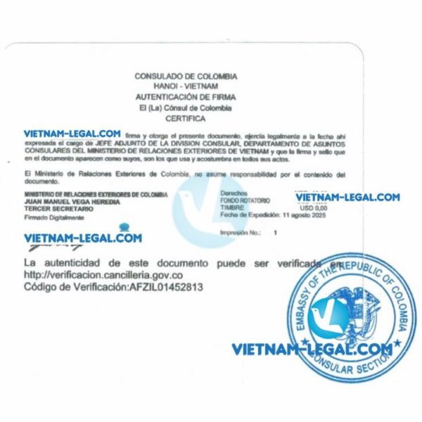 hopphaphoalanhsu.vn cung cấp dịch vụ tư vấn, hỗ trợ xin chứng nhận lãnh sự tại Đại sứ quán Colombia – Hợp pháp hóa lãnh sự các giấy tờ, tài liệu cấp từ Việt Nam để sử dụng tại Colombia.