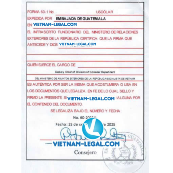 Kết quả của tài liệu, giấy tờ Việt Nam được chứng nhận lãnh sự để được công nhận và sử dụng tại Guatemala là tem, dấu của Đại sứ quán Guatemala.