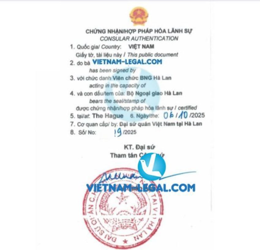 Kết quả của tài liệu, giấy tờ Ireland được chứng nhận lãnh sự, hợp pháp hóa lãnh sự để sử dụng ở Việt Nam là tem, dấu xác nhận của Đại sứ quán Việt Nam.